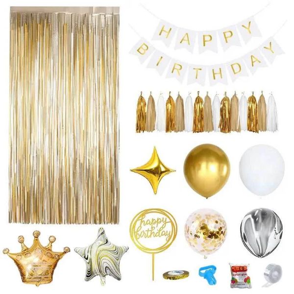 60 balonov različnih barv; 1x balon v obliki krone; 2x balon v obliki petkrake zvezde; 2x balon v obliki štirikrake zvezde; 1x zaveso iz bleščečih trakov; 1x transparent Vse najboljše za rojstni dan; 5x komplet pisanih okrasnih čopičev; 1x okras za torto Vse najboljše za rojstni dan; okrasni trak, pribor za zavezovanje balonov, lepilo in trak za pritrjevanje balonov.