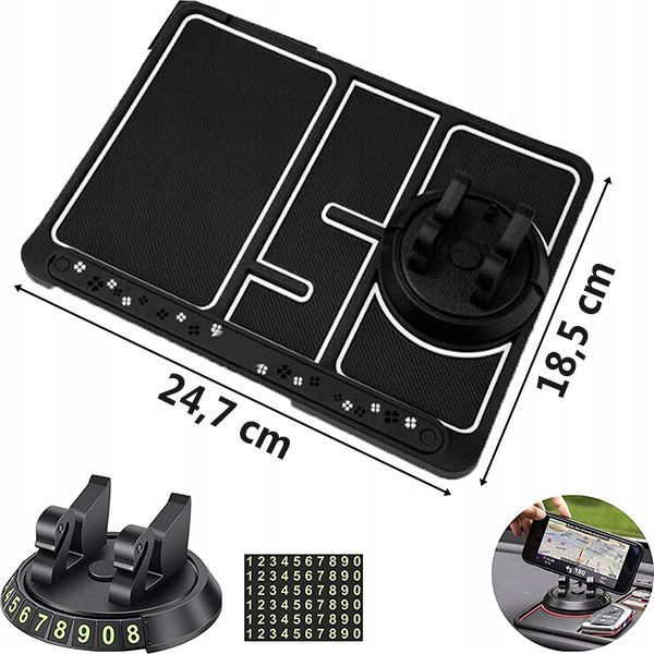 📏 Univerzalna združljivost: Z merami 24,7 x 18,5 cm se ta podloga brezhibno prilega vsaki avtomobilski armaturni plošči, kar zagotavlja tesno in varno namestitev.